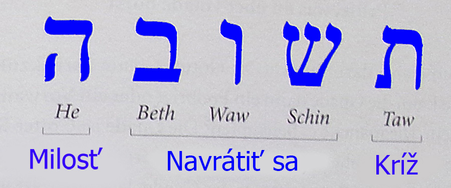 Medzi písmenami taw (kríž) a he (milosť) sú písmená schin, waw a beth a všetky tri písmená tvoria slovo schuv, ktoré znamená obrátiť sa, navrátiť sa